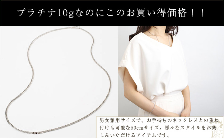 もっとも売れている2面カットキヘイは、シンプルで飽きがこない男女兼用のデザイン。どんな服装にも合わせやすく、お持ちのゴールドやプチペンダントとのコーディネートもオススメ!そのままネックレスとしても、お手持ちのペンダントトップを通していただいても。揺れるたびに重厚に輝く、この重量感、存在感は、プラチナだからこそ!2面カットのキヘイは飽きがこないデザインで高級感あふれるネックレスチェーンです。シンプルなデザインなのに存在感があり、チェーンに使用している地金以上のボリュームを感じます。つければとっても大人っぽい印象に♪地金が高くなっている今、この価格ほかではないですよ。
