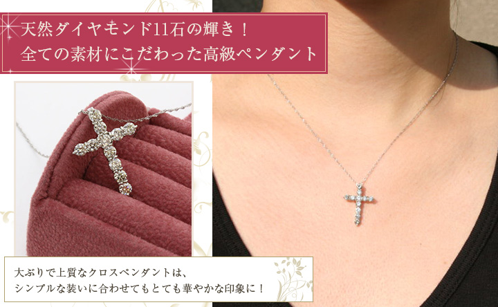 一粒でも十分存在感のある、大粒の天然ダイヤモンドを11石、合計1カラットも使用した、とてもゴージャスで大ぶりのクロスペンダント。