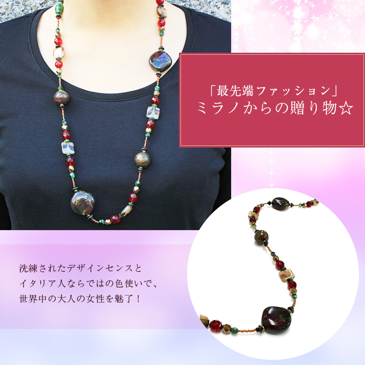 イタリアの最先端ファッションの都「ミラノ」。そこで活躍するジュエリーデザイナーのアヴェ・テッタマンティ。ベニスの熟練職人によるベネチアンガラスを使い、洗練されたデザインセンスとイタリア人ならではの色使いを持ち合わせ、イタリアはもちろん世界中の大人の女性たちを魅了しています。人気のロングタイプをクリスマスカラーの上品な色合いとシェイプで仕上げました。ベネチアンガラス、合金、樹脂を絶妙なバランスで使い、ボリューム感と軽い着け心地を実現。