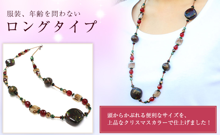 ![]() 留具はフック式留具部分は大きめの丸カンでフックを通しやすくなっています。ロングサイズなので頭からかぶることも可能! | ![]() クリスマスにぴったり♪おしゃれなデザインと落ち着いたクリスマスカラーの色合いはクリスマスのプレゼントにもおススメ☆ | ![]() プレゼントにもおススメ☆AVE CAPRICE専用のケースに入れてのお届けでギフトにも喜ばれます。 |
