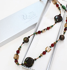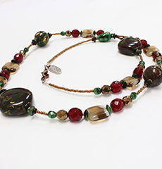 ムラーノ島の熟練職人による手作りベネチアンガラスと樹脂を絶妙なバランスで、ボリュームがあるのに軽い着け心地を実現。イタリアンデザイナーならではのハイセンスネックレス。クリスマスのプレゼントなどにおススメの色合いですが、デザイナーはNATURE(自然)とHARVEST(実り)をテーマにデザインしたそうです。その意味でも年中お楽しみいただける一本は持ちたいアイテムです。