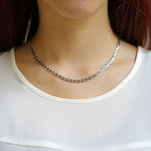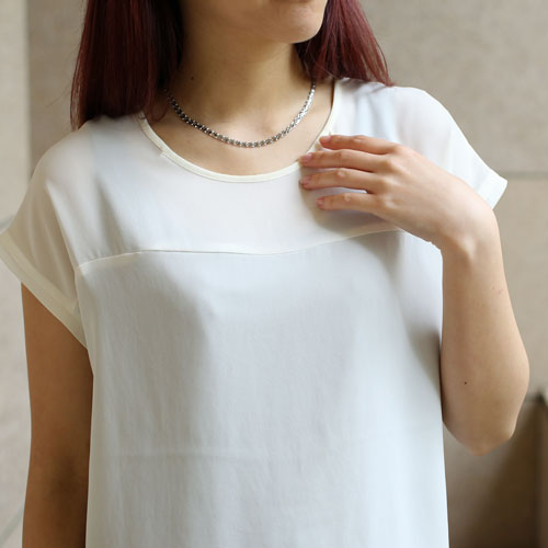 最高級素材である、純プラチナ(Pt999)を惜しみなく使用した、気品あふれるネックレス。熟練職人がパーツを一つ一つ丹念に組上げた華やか過ぎない、洗練されたデザインのネックレスは、落ち着いた大人の女性にぴったりです。普段の装いをぐっとエレガントに引き立ててくれます。