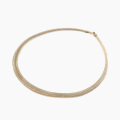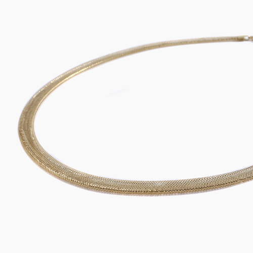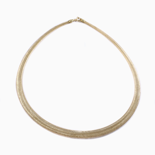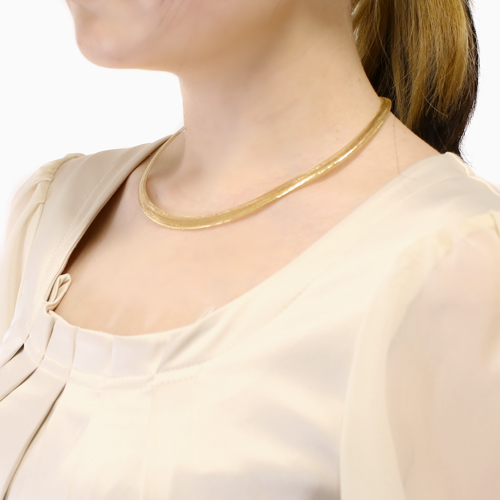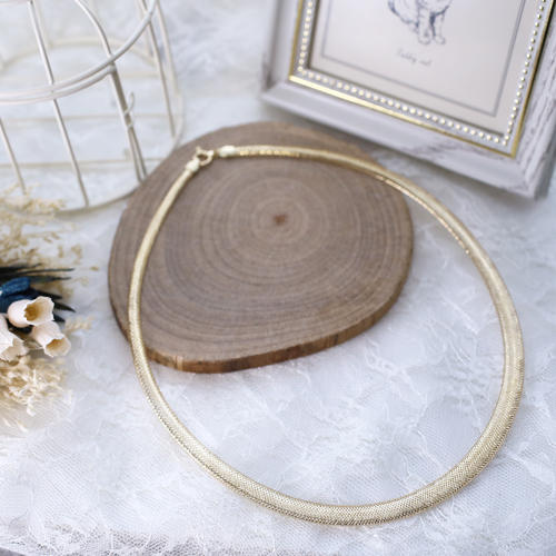 高級素材・18金を贅沢に使用した、シンプルなイタリア製中空(ホロー)オメガタイプネックレス。首を長く美しく見せるボリューム感を持たせた極太 7mm幅、ゆったりの長さの45cmタイプです。幅約3mmから徐々に胸元にかけて太く最大約7mmの迫力の存在感です。メッシュ仕上げなので非常に軽く、価格も抑えることができました。
