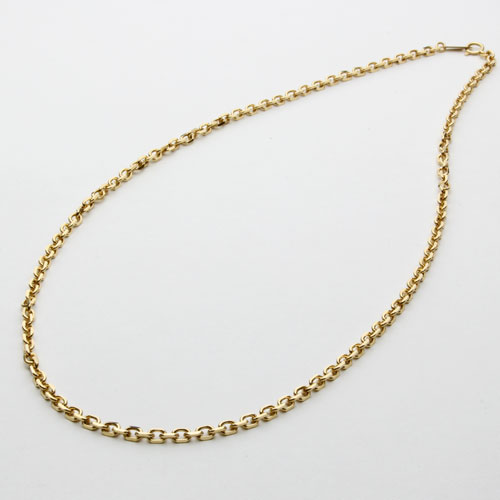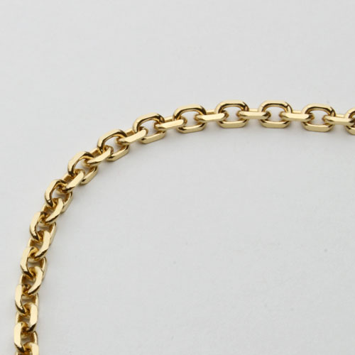 高級素材である、18金を惜しみなく使用した、気品あふれるチェーン。定番のキヘイチェーンはお持ちの方、人とは違うちょっとオシャレなチェーンをお探しの方におススメの華やか過ぎない、洗練されたデザインのチェーンの小豆。3.3mm幅のボリューム感とずっしり18金16.9gの満足感。50cmのゆったりサイズの男女兼用4面カットアズキチェーンは、着け心地も抜群!!プレート部分には、「K18(刻印)」が有り、素材と品質の良さも証明されています。表と裏に各2面のカットを加えた合計4面カットをほどこしたデザインが輝く多面を作り胸元を豪華に演出。