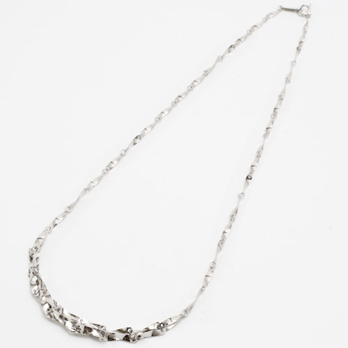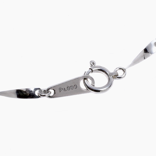 最高級素材である、純プラチナ(Pt999)を惜しみなく使用した、気品あふれるネックレス。胸元にボリュームをたっぷりと持たせ、華やかで洗練されたデザインのネックレスは、落ち着いた大人の女性にぴったりです。普段の装いをぐっとエレガントに引き立ててくれます。42cmという、ゆとりのあるサイズで、なめらかに肌に沿うネックレスは、着け心地も抜群!!また、純プラチナの品位証明の刻印、「Pt999」が入っており、素材と品質の良さも証明されています。板状のパーツにひねりを加えたデザインは首筋から胸元にかけてボリュームを持たせており服装やシーンに合わせた使い方ができます。