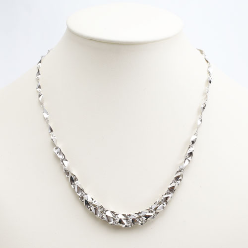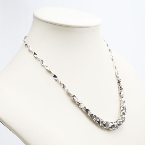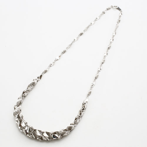 最高級素材である、純プラチナ(Pt999)を惜しみなく使用した、気品あふれるネックレス。胸元にボリュームをたっぷりと持たせ、華やかで洗練されたデザインのネックレスは、落ち着いた大人の女性にぴったりです。普段の装いをぐっとエレガントに引き立ててくれます。45cmという、ゆとりのあるサイズで、なめらかに肌に沿うネックレスは、着け心地も抜群!!また、貴金属製品の品位の証明の刻印、「Pt999」が入っており、素材と品質の良さも証明されています。板状のパーツにひねりを加えたデザインは首筋から胸元にかけてボリュームを持たせており服装やシーンに合わせた使い方ができます。高価な純プラチナをたっぷりと使用し、熟練職人が一つ一つ手作業で組上げた高品質ネックレスは大変お得です。