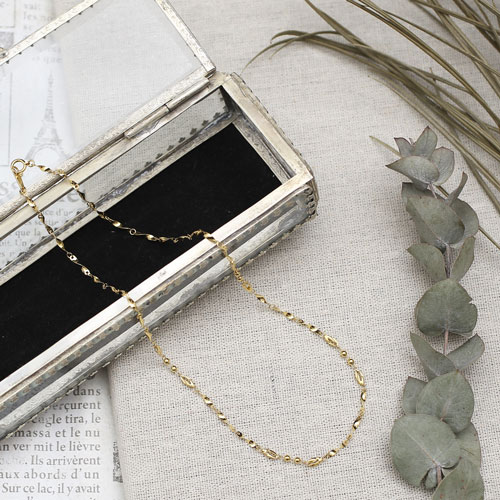 こちらのお店のネックレスを見ていた時、丁度セールになっていて細い18金ネックレスが欲しいかったのと、スライドチェーンで便利そうなので購入しました。小さいトップにピッタリでとても綺麗で長さ調節も出来てとても満足です。