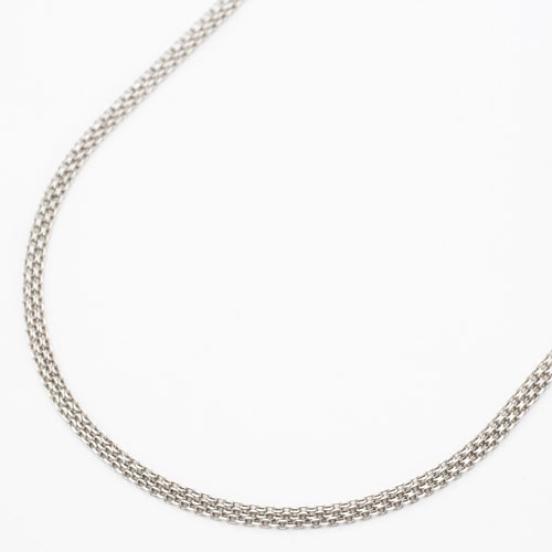 最高級素材である、純プラチナ(Pt999)を惜しみなく使用した、気品あふれるネックレス。華やか過ぎない、洗練されたデザインのネックレスは、落ち着いた大人の女性にぴったりです。普段の装いをぐっとエレガントに引き立ててくれます。45cmのゆったりゆとりのあるサイズで、なめらかに肌に沿うネックレスは、着け心地も抜群!! また、プレート部分には、「純Pt(刻印)」が有り、素材と品質の良さも証明されています。人気のアズキチェーンにカットを施し、よりキラキラ感を演出したデザインを同寸の3連にした贅沢なネックレス。たくさんの面が光を反射してキラキラと美しく輝きます。