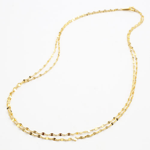 最高級素材である、純金(K24)を惜しみなく使用した、気品あふれるネックレス。華やか過ぎない、洗練されたデザインのネックレスは、落ち着いた大人の女性にぴったりです。普段の装いをぐっとエレガントに引き立ててくれます。42cmと43cmの異なる長さのレイヤードが、2連になることで繊細ながらボリュームを持たせ動くたびに豪華な煌めきを放ちます。また、プレート部分には、「K24(刻印)」が有り、素材と品質の良さも証明されています。バイシクル・ペダルをイメージしたデザインを縦と横に交互に連ねてより立体感を出したチェーンの2連ネックレス。たくさんの面が光を反射してキラキラと美しく輝きます。