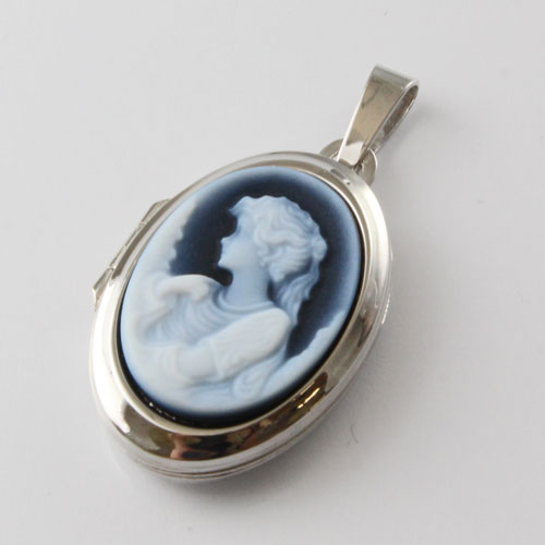 女性の彫刻を施したストーンカメオが付いたロケットペンダント。