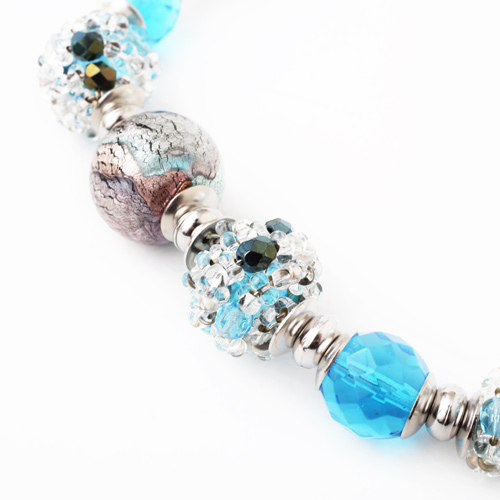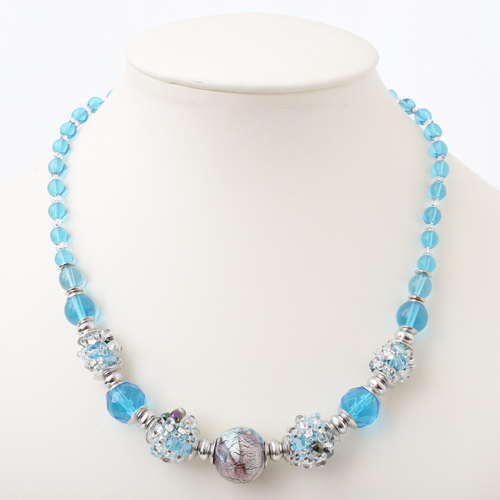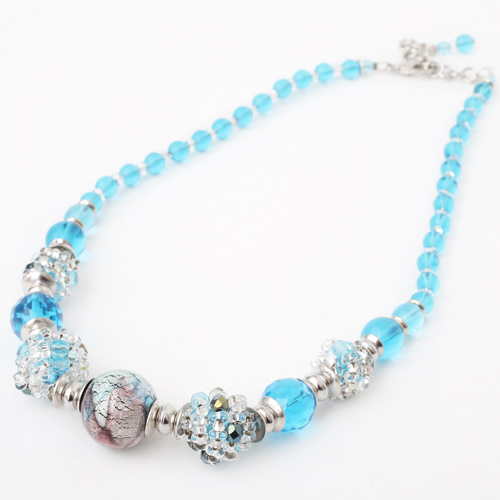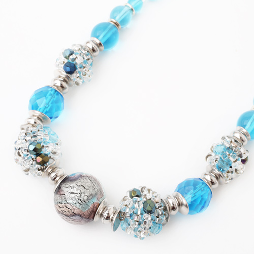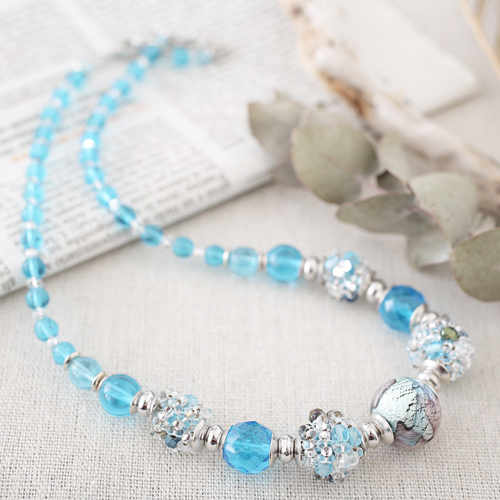 イタリア・ムラーノ島で、マエストロと呼ばれる熟練した職人たちが、べネチアンガラスの伝統の技法を用い一つ一つ丁寧に手作りしています。その美しい模様は、芸術品とまで称されるほど。手作りのため、まったく同じものは2つとなく、世界にたった一つのあなただけのネックレスといえます。そのベネチアンビーズガラスを使って、ミラノで人気の若手アクセサリーデザイナー・キアラ(CHIARA)がおしゃれでわくわくする感性のネックレスを作りました。ブルー系に銀箔色を配した落ち着いた大人の色使い、大胆にでも決して派手ではなく日本の女性に気軽に着けてもらえるように考えたそうです。べネチアンガラスの花が美しく咲き誇る、とってもおしゃれなネックレス。頑張った自分へのご褒美に、また記念日のプレゼントにもぴったりです。