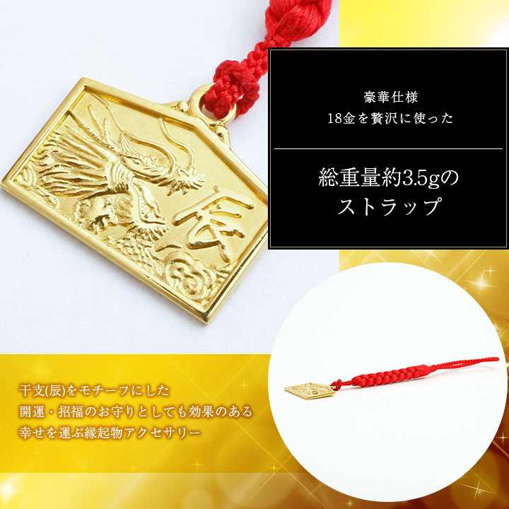 高級素材18金(K18) 3gを贅沢に使用した、絵馬型の干支(辰)ストラップ&根付。十二支で唯一の想像上の動物の竜は古代の中国の神話で神獣とされており、皇帝のシンボルとして、最上級の意味で用いられていました。この干支(辰)は、皆様のご家庭に開運・隆盛のシンボルとして必ずや幸福を招いてくれるでしょう。