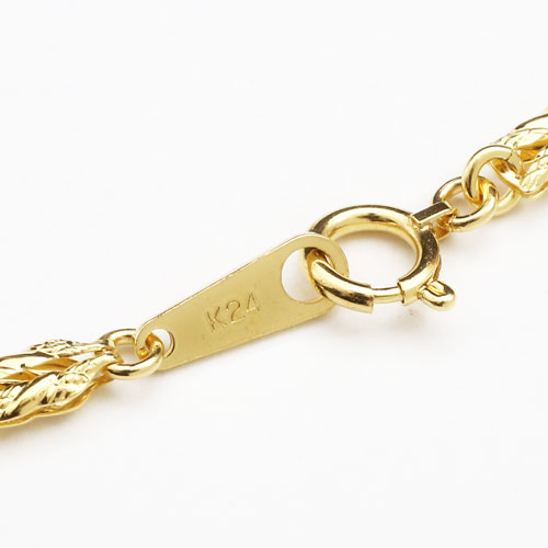 45cmという、ゆとりのあるサイズで、なめらかに肌に沿うグラデーションネックレス(首筋より胸元にかけて緩やかに太くなる)は、着け心地も抜群!!また、純金の品位の証明の刻印、「K24」が入っており、素材と品質の良さも証明されています。