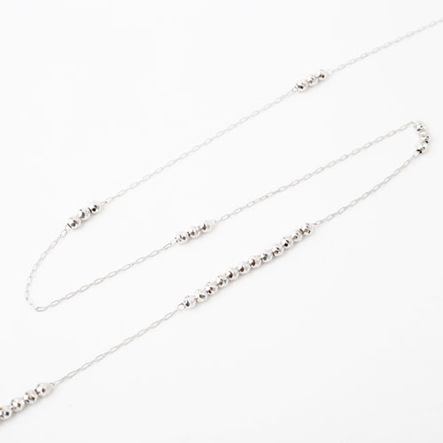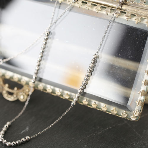 価格を抑えるためにチェーンは細いアズキを使用しました。しかし細いがためによりミラーボールのキラキラ感が強調され、繊細な輝きを演出しています。センター部分にミラーボールの数を多くしてバランスよく配置されたミラーボールが立体感を出しシンプルながらも存在感のあるロングチェーンに仕上げました。