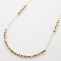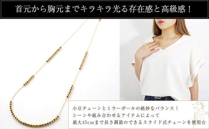 ミラクル(奇蹟)カットを施した18金のミラーボールを使った豪華なネックレスは、胸元にまるで球体のダイステーション・レイアウトに並べた美しいキラキラ感が魅力のスライドネックレスです。2.5mm幅のミラーボールを配して高貴なキラキラ感を演出しました。多面カットとそれぞれの角度が微妙にランダムに変わり、神秘的な輝きを胸元に、見る人の視線をくぎづけにします。チェーンには可愛い18金のアズキを使用しており、シリコンボールのスライド仕様を採用しており、34cmから45cmまでのお好みの長さに調整できます。首元にぴったりのドックタイプ、Tシャツの上に出すなどアレンジをお楽しみいただけます。どんなスタイルにも合わせやすく、重ね着けにもお勧めのネックレスは大活躍すること間違い無しです。飽きのこないシンプルなデザインだから、きっと長く大事にお使い頂けます。他のペンダントとのコーディネートにもちょうど良く、アクセサリーのおしゃれの幅も広がります。