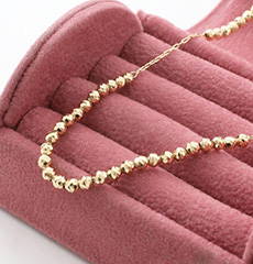 一見シンプルなネックレスですが、当店でロングセラーとなっている18金ミラーボールよりも細かいカットを施したハニーカット!光を多く取り込み、より輝きが増すデザインに。角度によって光の変化を映し、デコルテを美しく華やかに彩ります。チェーンには女性らしい華奢で繊細なアズキチェーンを使用。ミラーボールの高級感とアズキチェーンの持つフェミニンな雰囲気を加えることでクラス感ある仕上がりに。肌なじみの良いイエローゴールドカラーで、デイリーからパーティーシーンまで大活躍。ひっそりと放つ輝きは、コーディネートが引き立ち、自分らしさをアピール。お持ちのネックレスとの重ね付けにも相性抜群なところもポイント。トレンドに流されることなく、エイジレスでいつまでもお使いいただける人気アイテムです。