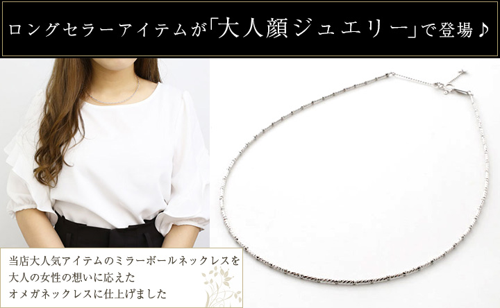 長さにもこだわりました。約40cmから45cmまでのお好みの長さに調整できるシリコンスライドボールも標準でセットしています。 どんな服装にも合わせやすく、カジュアルはもちろん、オフィススタイルやフォーマルなスタイルに合わせて頂いても素敵です!また、お持ちのペンダント用のチェーンとしても、オメガタイプは人気があり、おススメします。