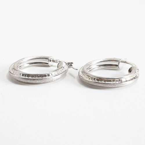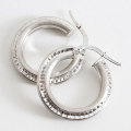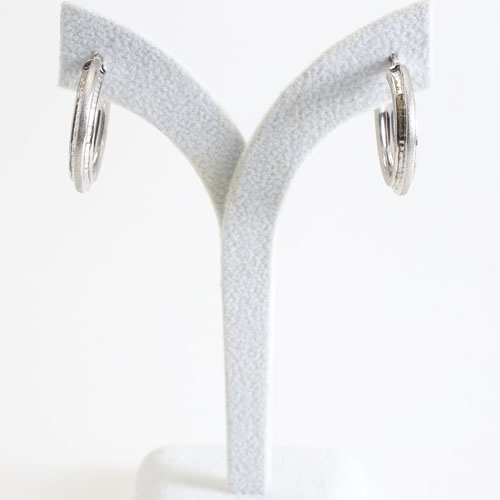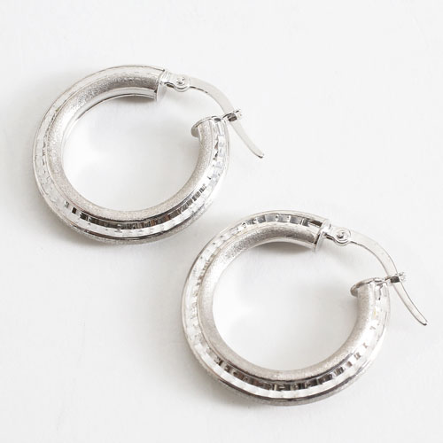 高級素材・18金をたっぷりと贅沢に使用した、ゴージャスなイタリア製中空(ホロー)ホワイトカラースターダストピアス。直径約22mmの大きさで、約3.8mm幅のセンター部分のスターダスト仕上げがひと際、細かいダイヤのような魅力的な輝きを放っています。 また、イタリアの最先端ホロー技術と相俟って、ボリュームがあるのに軽い着け心地を可能にしました。