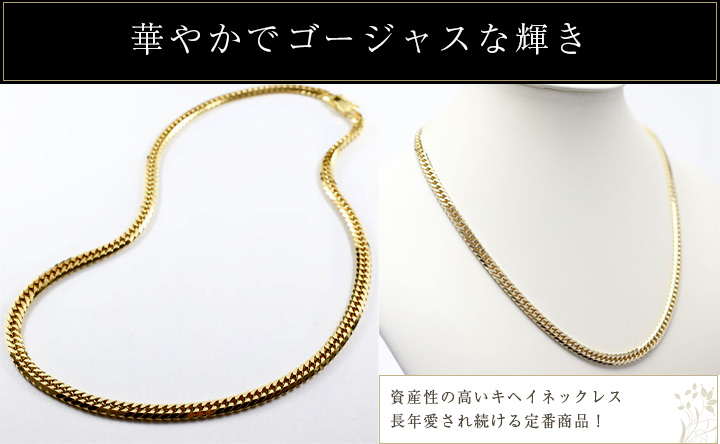 シンプルながら上品な輝きのある喜平ネックレスは、男女問わず幅広い年齢層に受け継がれ、愛され続けています。装飾品としてはもちろん、身に着けていられる資産としてもかなり人気の商品です。上下2面と斜めに4面カットを施している為、光の反射でキラキラとした地金の輝きも楽しめ、首元を華やかで上品な印象にしてくれます。留具部分には「造幣局検定(刻印)」が有り、素材と品質の良さも証明されております。ゴールドの温かみのある光は高級感あふれ上質な他のどの貴金属とも比べ物にならないほどのまばゆい輝きを湛えており、その美しさゆえに大切な人への贈り物としてもおすすめです。 しっかりとしたケースで、プレゼント包装も無料で対応しておりますのでプレゼントとして最適です。