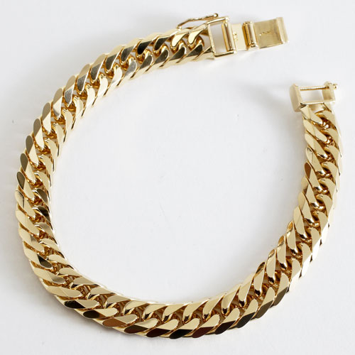 ダブル6面カットを施したキヘイブレスレット上下2面と斜めに4面カットを施しダブル(通常より細かく)で編み上げました。通常の2面カットに比べ圧倒的にカット面が多いため、光の反射面も多くなり輝きが断然違います。18金を30g以上も使い、これだけ手の込んだチェーンは大変買い得です。フォーマルの席はもちろん、シンプルで使いやすいデザインは普段のおしゃれにも最適!ひとつ持っていればとても安心。特別な時のために揃えておきたいジュエリーです☆