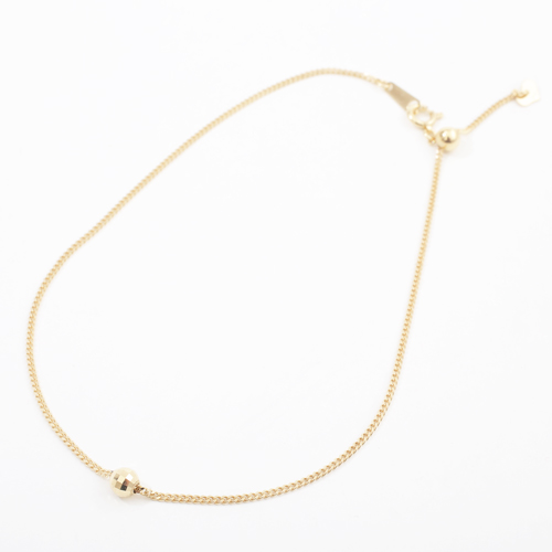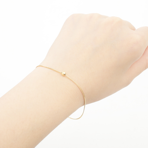 高級素材・18金(K18)を贅沢に使用した、繊細で細くシンプルなのに存在感抜群のキヘイブレスレット。さり気ないおしゃれを手首に演出してくれます。リストウォッチやダイヤモンドのブレスレットなどとのコーディネートをお楽しみいただけます。どんな服装にも合わせやすく、カジュアルはもちろん、オフィススタイルやフォーマルなスタイルに合わせて頂いても素敵です。しかも約23cmまでのお好みの長さに調整できるスライド式がうれしい。ブレスレットのセンター部分には、ワンポイントのミラクルカットのミラーボールがキラリと輝き、エンド部分には可愛いハートのチャームが付いた仕様です。長さ約23cmは一般的にアンクレットとしてもお使いいただけるサイズですので是非お試し下さい。