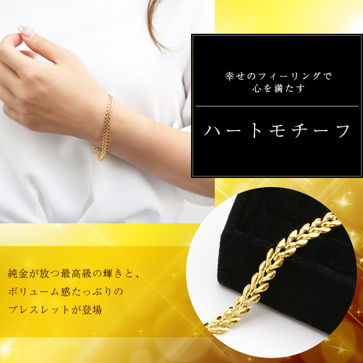人気のハートモチーフその存在感と気品高さが際立つ純金4.3g使用のデザインブレスレット |