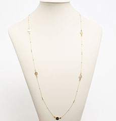 幻想的なフルムーンのモチーフパーツをステーションに配した新しいデザイン、ロングサイズの80cmネックレスです。80cmのロングサイズネックレスは留具を外さずに頭からかぶれるので忙しい時などに重宝します。Tシャツやセーターの上からコーディネート。繊細で可憐なゴールドの輝きが大人の魅力を演出します。18金のロングサイズネックレスがこの価格で手に入るのは驚きですね。プレート部分には「K18」の刻印が入っています。上品で繊細なデザインと存在感が魅力の最新18金ロングサイズネックレスはプレゼントにもお勧めです。