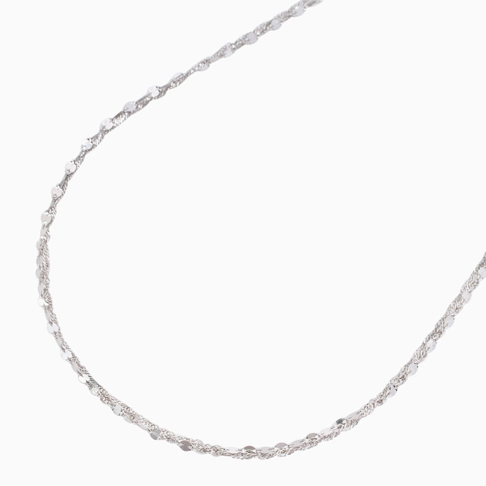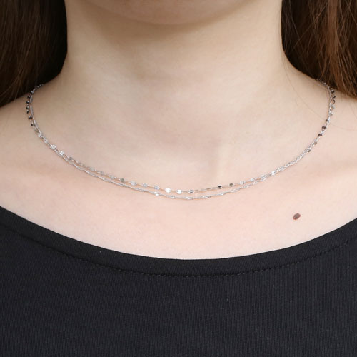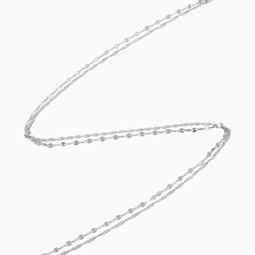 人気のスクリューチェーンとペダルチェーンの2本を使った上品で存在感が抜群の同寸の2連ネックレス。縦と横の交互が織り成すランダムな輝きが華やかで豪華な印象を作ります。最高級素材・Pt999のみで作った落ち着いたデザインは、どんなスタイルにも合わせやすく、普段の装いをぐっとエレガントに引き立ててくれます。