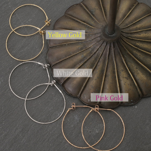 キラキラ感が魅力のカットを施したフープピアスを、人気の18金で作りました。 高級感漂う、一つは持っていたい定番フープピアスです!!シンプルだからこそ、いつまでも飽きずにお使いいただけます!!菱形のカットを全面に施していますので、耳元をゴージャスに、それでいて上品に演出。最も好まれているデザインの一つです。いつまでも色あせることの無い、高級素材の18金は、まさに一生もの!!年齢やスタイルを選ばないシンプルなデザインなのでプレゼントにも最適です。