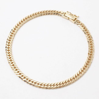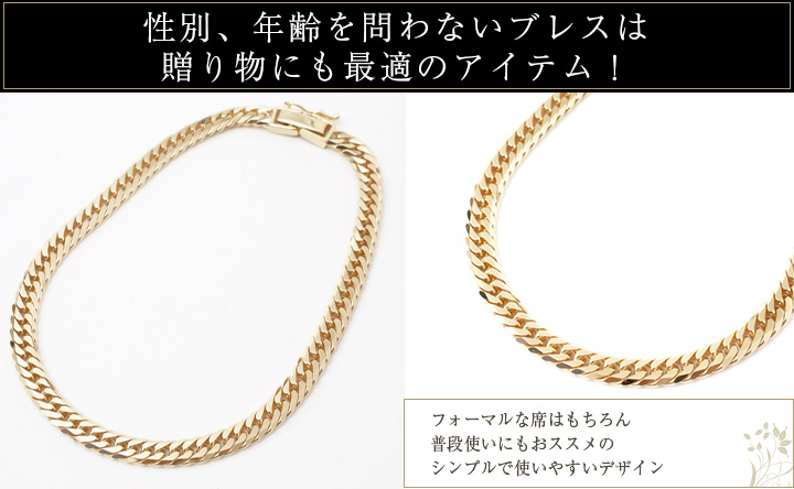 シンプルでいつまでも変わらず飽きのこない喜平ブレスレット。上下2つの対角線上に2つずつ平面が作られ、駒はダブルつながりで、カット面の輝きとしなやかな着用感が大変人気です。また光の反射でキラキラとした地金の輝きも楽しんで頂けます。シンプルで使いやすいデザインは普段のおしゃれにも最適!ひとつ持っていればとても安心。特別な時のために揃えておきたいジュエリーです☆季節を問わずどんなシーン・服装にも合わせやすいので、抵抗なく永くお使いいただけ、無料ケースでのお届け!またプレゼント包装も無料で対応しておりますので贈り物としても最適です!