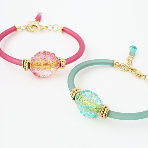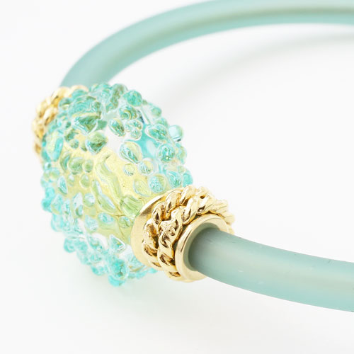 そのベネチアンガラスを使って、ミラノで人気の若手アクセサリーデザイナー・キアラ(CHIARA)がおしゃれでわくわくする感性のハンドアクセを作りました。グリーン系の色を配した落ち着いた大人の色使いは日本の女性に気軽に着けてもらえるように考えたそうです。