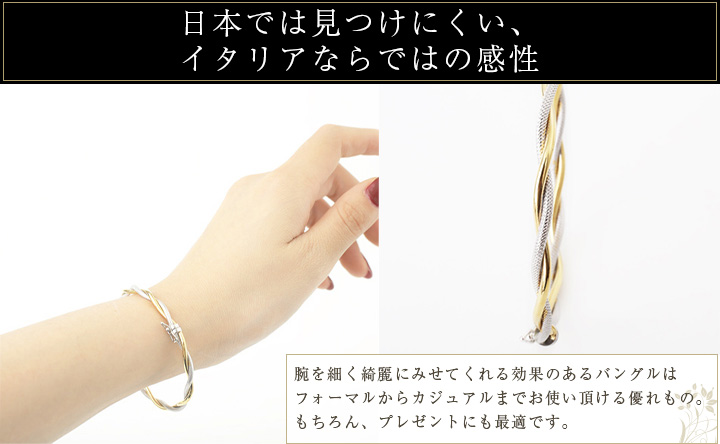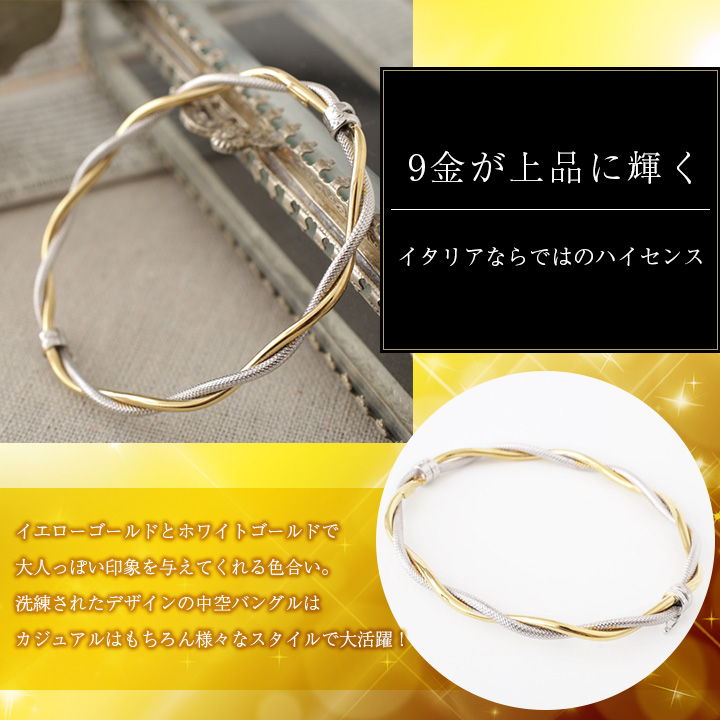 高級素材・9金をたっぷりと贅沢に使用した、ゴージャスなイタリア製中空(ホロー)イエローカラーとホワイトカラーの9金チューブひねりバングルブレスレット。洗練されたイタリアならではのデザインとシンプルなのに存在感のあるハイクオリティ。どんな服装にも合わせやすく、ボリュームがあるのに軽い着け心地がうれしいです。光沢のイエローゴールドとハンマリング加工のつや消しホワイトゴールドを見事にひねって仕上げたイタリアならではの逸品です。