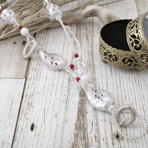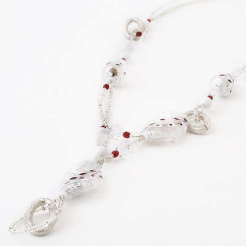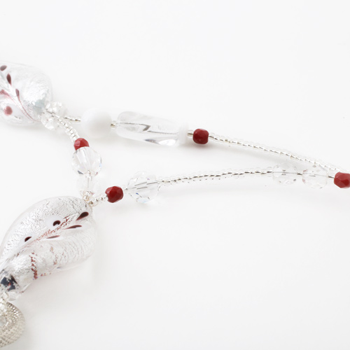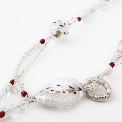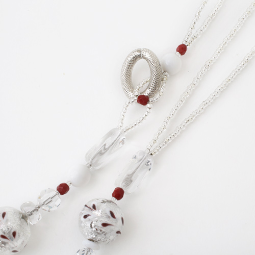 ホワイトカラーベースの美しいなネックレス。ベネチアンガラス、合金、樹脂を絶妙なバランスで使い、ボリューム感と軽い着け心地を実現。長さもゆったりの約57cm。 これからの季節、プレゼントにもぴったりですよ。