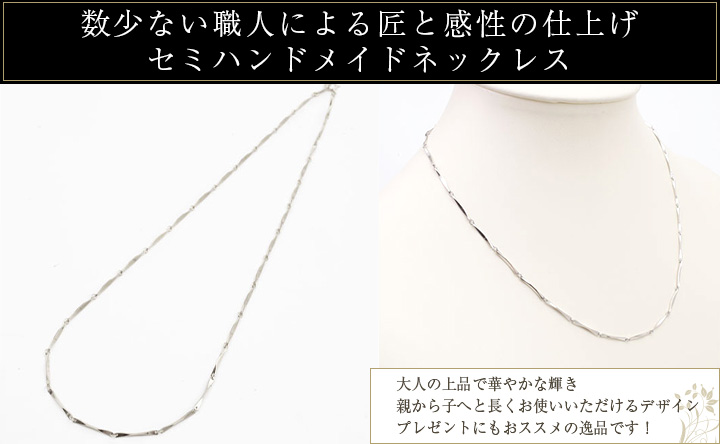 高級素材であるプラチナ850を惜しみなく使用した、シンプルだけど華やかさのある小波切子デザインのネックレス。小波をモチーフにした繊細なデザインは気品ある上品な大人っぽさを演出♪シンプルなので普段使いからパーティーなど色んなシーンに大活躍!性別、年齢関係なくお使い頂けるネックレスはお持ちのペンダントやチェーンとの重ね着けにも最適です!!熟練職人が仕上げるセミハンドメイドブレスレットは自分へのプレゼントや大切な人へのプレゼントに・・・。