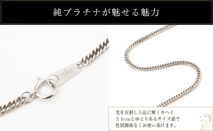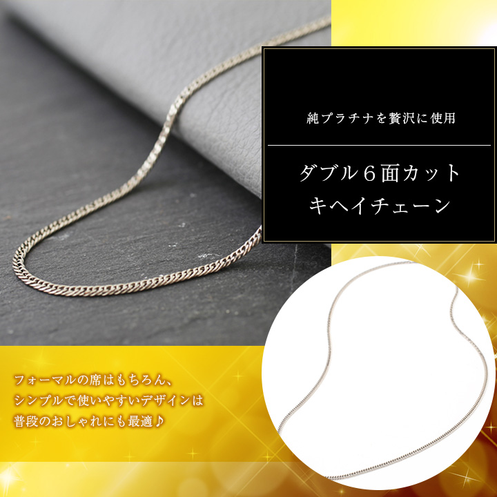 最高級素材である純プラチナ(Pt999)を惜しみなく使用したダブル6面カットキヘイネックレス。50cmと長さにもゆとりがあり男性女性関係なくお使い頂ける優れもの。反射面が多い6面カットキヘイチェーンは光を反射し、上品にきらきらと美しい輝きを放ちます。シンプルなデザインなので毎日のお洒落にも大活躍間違いなし!普段使いからパーティースタイルまで幅広いコーディネートの定番アクセサリーです☆特別な日に特別な人への贈り物や毎日の自分へのご褒美にも最適です。ひとつひとつ厳重ね検品、チェックを通過していますので、どうぞご安心下さい。