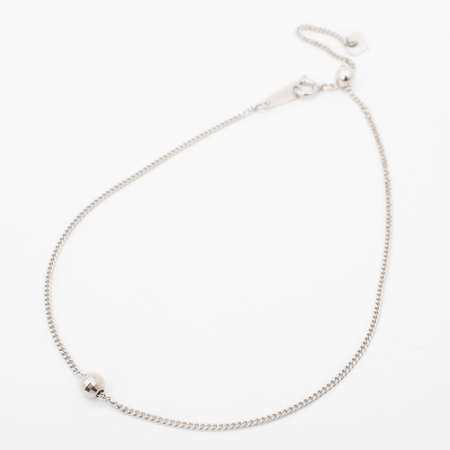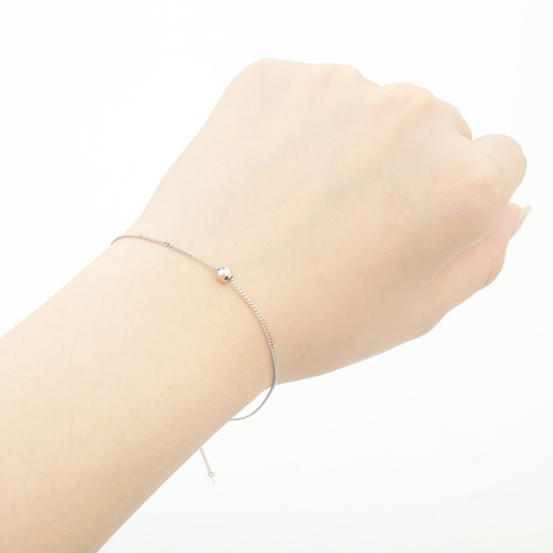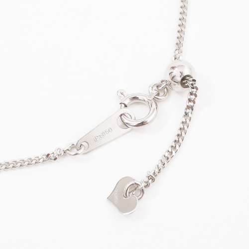 高級素材・プラチナ(Pt850)を贅沢に使用した、繊細で細くシンプルなのに存在感抜群のキヘイブレスレット。さり気ないおしゃれを手首に演出してくれます。リストウォッチやダイヤモンドのブレスレットなどとのコーディネートをお楽しみいただけます。どんな服装にも合わせやすく、カジュアルはもちろん、オフィススタイルやフォーマルなスタイルに合わせて頂いても素敵です。しかも約23cmまでのお好みの長さに調整できるスライド式がうれしい。ブレスレットのセンター部分には、ワンポイントのミラクルカットのミラーボールがキラリと輝き、エンド部分には可愛いハートのチャームが付いた仕様です。長さ約23cmは一般的にアンクレットとしてもお使いいただけるサイズですので是非お試し下さい。