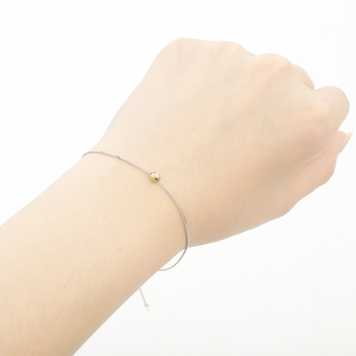 高級素材・プラチナ(Pt850)を贅沢に使用した、繊細で細くシンプルなのに存在感抜群のキヘイブレスレット。さり気ないおしゃれを手首に演出してくれます。リストウォッチやダイヤモンドのブレスレットなどとのコーディネートをお楽しみいただけます。どんな服装にも合わせやすく、カジュアルはもちろん、オフィススタイルやフォーマルなスタイルに合わせて頂いても素敵です。しかも約23cmまでのお好みの長さに調整できるスライド式がうれしい。ブレスレットのセンター部分には、ワンポイントの18金ミラクルカットのミラーボールがキラリと輝き、エンド部分には可愛いハートのチャームが付いたコンビ仕様です。長さ約23cmは一般的にアンクレットとしてもお使いいただけるサイズですので是非お試し下さい。