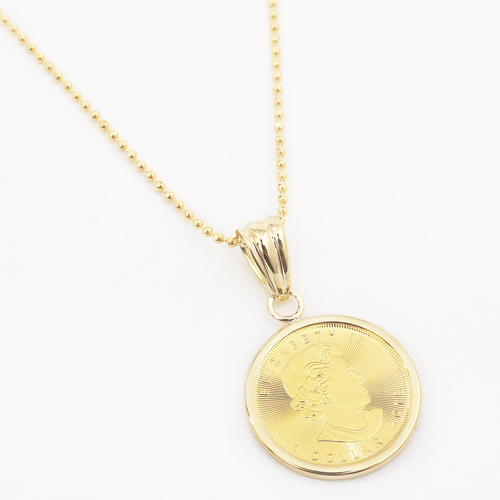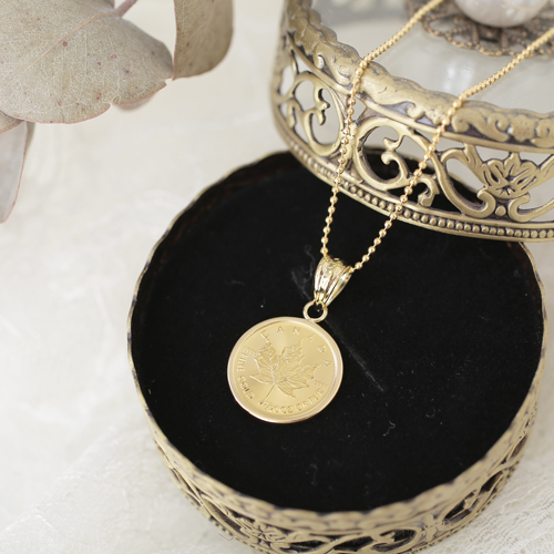 世界的に有名なカナダのメイプルリーフ金貨。カナダ政府鋳造、純金メイプルリーフコインに18金のシンプルフセコミ枠を巻き、イタリア製チェーンをセットしたコインペンダント。フセコミ枠なので爪がなく、両面使える美しいリバーシブル仕様。表はカエデの葉、裏にはエリザベス女王の肖像とその日の気分で使い分けてください。どんな服装にも合わせやすく、コーディネートのバリエーションが広がります。表面には純金の証し"フォーナイン9999"の刻印が施されており、確かな信頼とこだわりを感じます。金・地金が高騰している昨今、資産価値もありお守りとしてや特別なプレゼントにも喜ばれます。