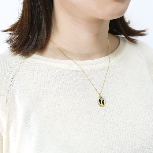 10金の地金を使った人気の馬モチーフは、落ち着いた大人の印象と引締まったオニキスのブラックの上に美しいキラキラ感を演出します。胸元で揺れるペンダントは微妙に角度が変わると、神秘的な輝きを放ち、存在感をアピールします。男性の方にも抵抗なく着けて頂ける男女兼用デザインの為、プレゼントやペアーでもお勧めです。チェーンは、イタリアで人気のカットボールを使用。落ち着いたイタリアンデザインチェーンは、センターのきらめきに華を添えています。どんなスタイルにも合わせやすく、重ね着けにもお勧めのペンダントは大活躍すること間違い無しです!きっと長く大事にお使い頂けますよ。他のペンダントとのコーディネートにもちょうど良く、アクセサリーのおしゃれの幅も広がります。