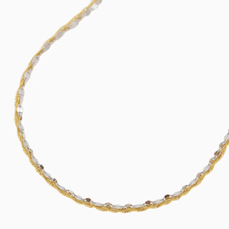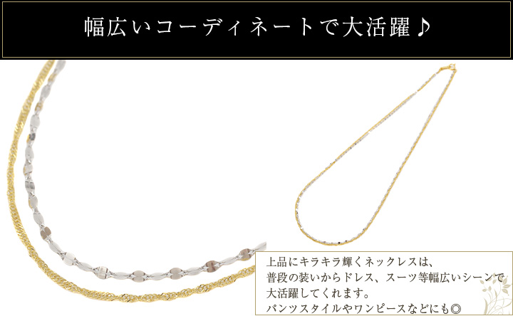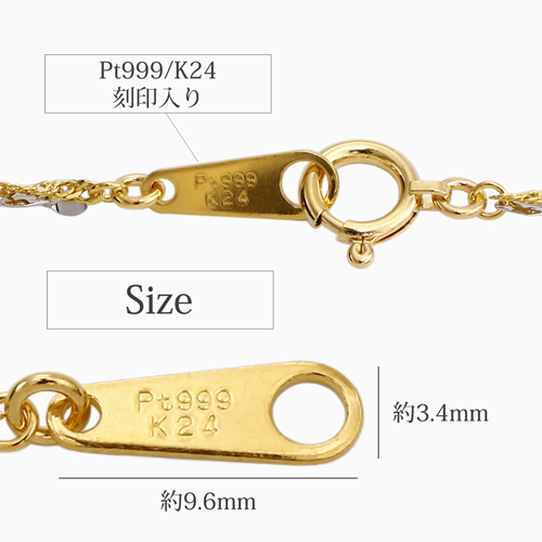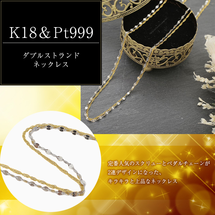 最高級素材である純金(K24)のスクリューチェーンと、純プラチナ(Pt999)のペダルチェーンを合わせた、上品でエレガントなネックレス。キラキラ感がアップしたネックレスはどんなスタイスにも合わせやすく、女性へのプレゼントとしても人気のアクセサリーです。