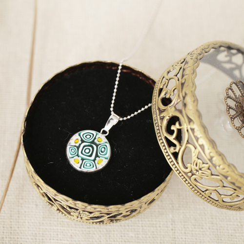 イタリア・ムラーノ島で、マエストロと呼ばれる熟練した職人たちが、べネチアンガラスの伝統の技法を用い一つ一つ丁寧に手作りしています。その美しい模様は、芸術品とまで称されるほど。手作りのため、まったく同じものは2つとなく、世界にたった一つのあなただけのペンダントといえます。細かい花模様のガラスの棒を小さくカットして円形に並べて、窯の中で溶かして一体化して作られた、まさに熟練職人による技。ミレフィオリ(幾千もの花)と言われているこのペンダントはイタリアでは定番の昔から人気のアクセサリーです。 これからの季節、プレゼントにもぴったりですよ。