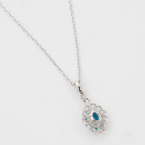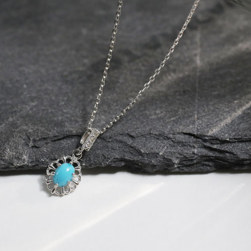 アンティーク調のトルコストーンペンダント!チェーンの素材にも18金ホワイトゴールドを使用!小さくてかわいいデザイン♪そのままシンプルにお使い頂いても、別のチェーンやペンダントと合わせて重ねづけしてもOK! どんなスタイルにも合わせやすいので、普段づかいのジュエリーとしても大活躍すること間違い無し♪ 流行や年齢に関係なく、きっと長く大事にお使い頂けます。小さくて可愛いペンダントはプレゼントにも大変おススメのジュエリーです。