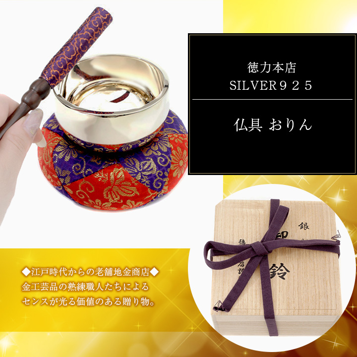 その徳力本店謹製、シルバー925をたっぷり240g以上使用した仏具のおりんをお楽しみください。気品あふれる銀製の仏具をお飾りしてご先祖の御霊をご供養してください。澄みきった銀製のおりんの優雅な音色はこれから訪れる輝かしい未来に希望と活力を与えてくれることでしょう。仏壇新設の祝いや記念品として身内の方への贈り物としても、たいへん喜ばれる価値のある逸品です。