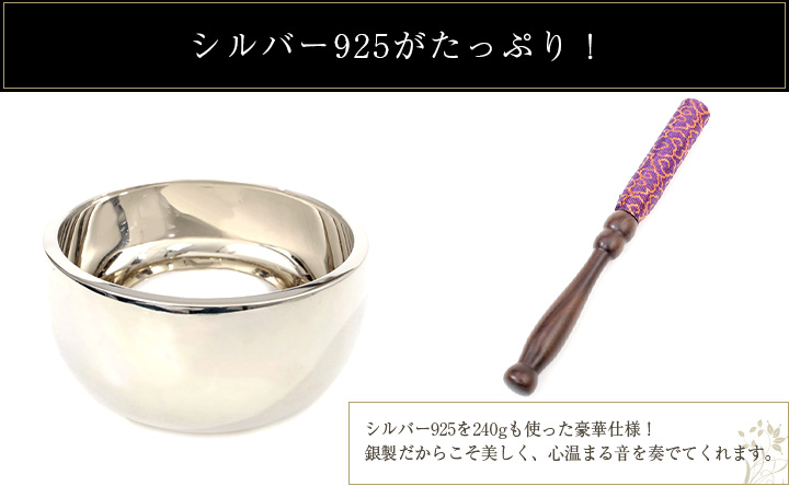 銀製(シルバー925)を使用した、上品ね音色を響かせるおりん。専用の鈴台と鈴棒付きで、専用の桐箱に入った豪華仕様!シルバーを240gも使用した仏具のおりんをお楽しみください。仏壇新設のお祝いとしての贈り物にもおすすめです。