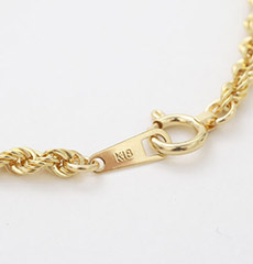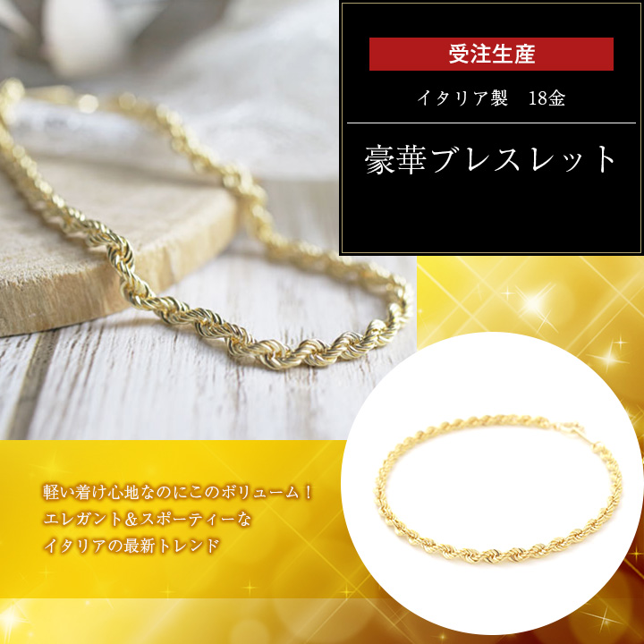 高級素材・18金をたっぷりと贅沢に使用した、ゴージャスで大人気の定番チェーンのイタリア製パイプロープブレスレット。国産には見られないデザインは美しく落ち着いた印象を演出してくれます。イタリアの最先端ホロー(中空)技術は着けているのを感じさせない、驚くほど軽い仕上げです。長さ20cmサイズは、手首に多少垂れる感じです。長めをご希望の場合はお問合せ下さい。ボリュームがあるのに軽い着け心地がうれしいブレスレットです。どんな服装にも合わせやすく、カジュアルはもちろん、オフィススタイルやフォーマルなスタイルに合わせて頂いても素敵です。ブレスレットの留具部分には、 「K18」が刻印されており、安心してお使いいただけます。