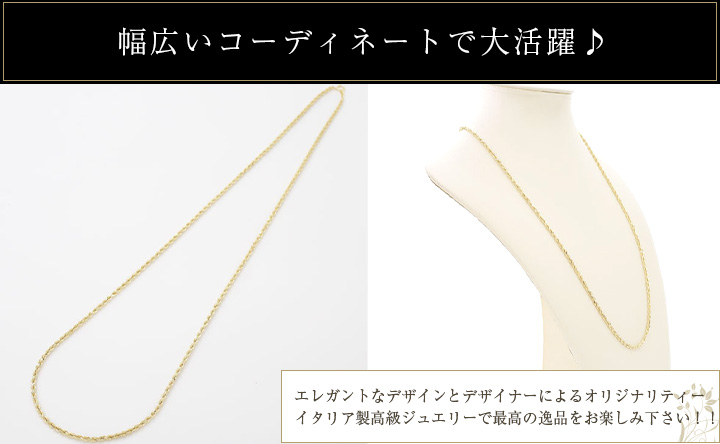 高級素材・18金をたっぷりと贅沢に使用した、ゴージャスで大人気の定番チェーンのイタリア製パイプロープネックレス。国産には見られないデザインは美しく落ち着いた印象を演出してくれます。イタリアの最先端ホロー(中空)技術は着けているのを感じさせない、驚くほど軽い仕上げです。長さ70cmのゆったりサイズで首回りにゆとりのある感じです。さらに長めをご希望の場合はお問合せ下さい。ボリュームがあるのに軽い着け心地がうれしいネックレスです。
