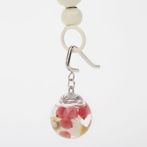 ハーバリウムのポニーフックです。ガラスドームの中には、白いグリグシアと鮮やかなピンクのペッパーベリーの花材を立体乾燥させ、押し花とはまた違った華やかさがあります。オイルの中でみずみずしく動くので様々な花の表情をお楽しみ下さい。普段使いから、お出かけなど、幅広くお使い頂けるアイテムです。※繊細な作品の為、衝撃・落下にはご注意下さい。また、天然の素材を使用している為、中に入っている木の実などが割れてしまう場合がございます。予めご了承ください。※ご使用後は乾いた柔らかい布などで手入れ後、天然色の素材は経過により退色致しますので、直射日光をさけ、保管して下さい。