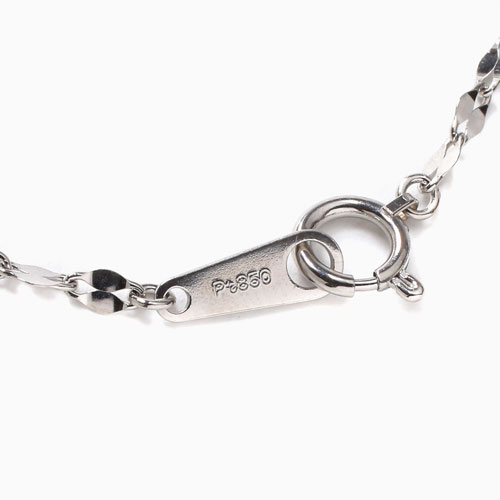 お持ちの細めのブレスレットやウォッチとのコーディネートにもお勧めのデザインです。プレート部分にはPt850 刻印が入っており、素材の純度が証明されています。