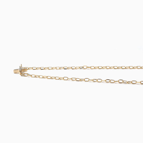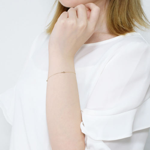 アズキチェーンの縦と横の交互が織り成すランダムな輝きが手首に華やかで豪華な印象を作ります。高級素材・10金のみでお作りしたクロスをモチーフにしたデザインは、どんなスタイルにも合わせやすく、普段の装いをぐっとエレガントに引き立ててくれます。