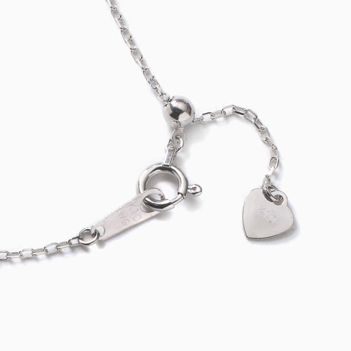 お持ちの細めのブレスレットやウォッチとのコーディネートにもお勧めのデザインです。プレート部分にはK10WG 刻印が入っており、素材の純度が証明されています。
